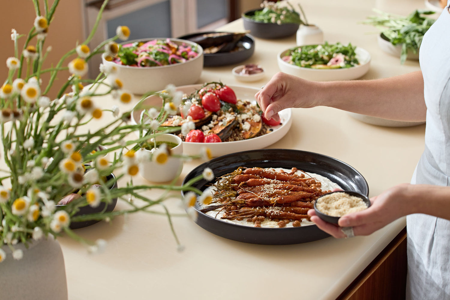 We designed the Platter for evening drinks with family and friends. Filled with soft cheeses, biscuits and olives, it makes the least curated cheese board look like it's out of a magazine. It's also great for serving main dishes - from a Sunday Roast to simple crowd pleasers, like the Roast Carrots and Pumpkin Salads (find the recipes for both on our blog).
